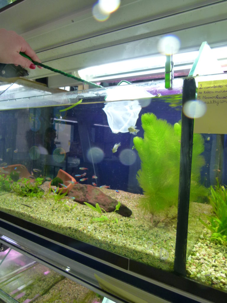 Puis retour dans notre animalerie pédagogique : pendant qu’un groupe procède à l’acclimatation des poissons dans leur nouvel environnement, l’autre groupe vérifie si la commande est conforme, puis calcule les tarifs…